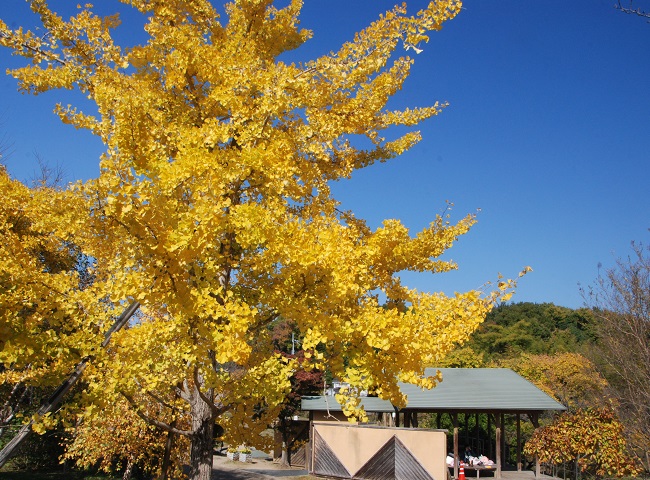 「大型遊具」近くのイチョウです。すぐ横のシラカバとエノキも黄色くなっています。