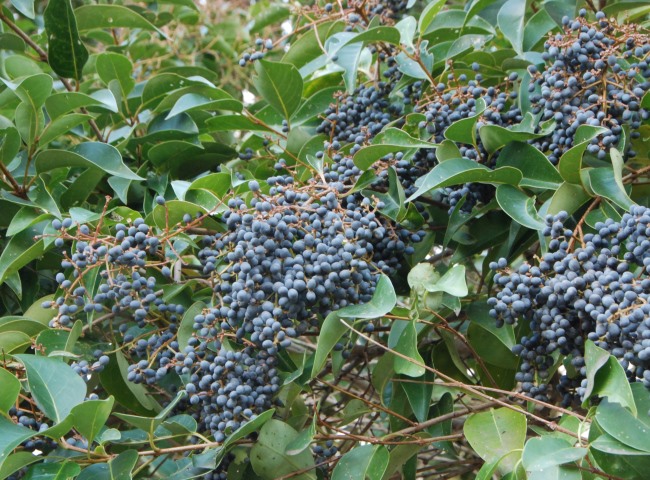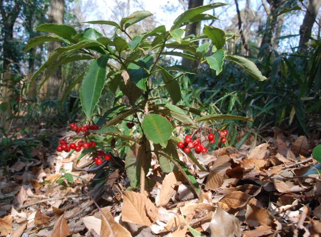 「あじさいの小径」の園路沿いで、マンリョウ(万両)が赤い実を付けています。お正月の縁起木として親しまれています。