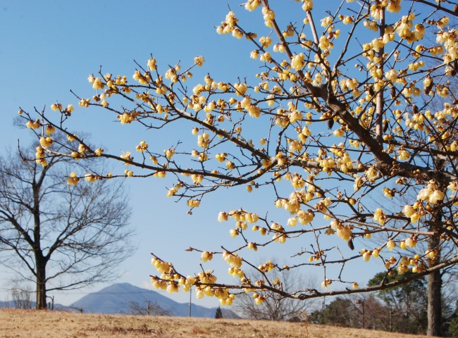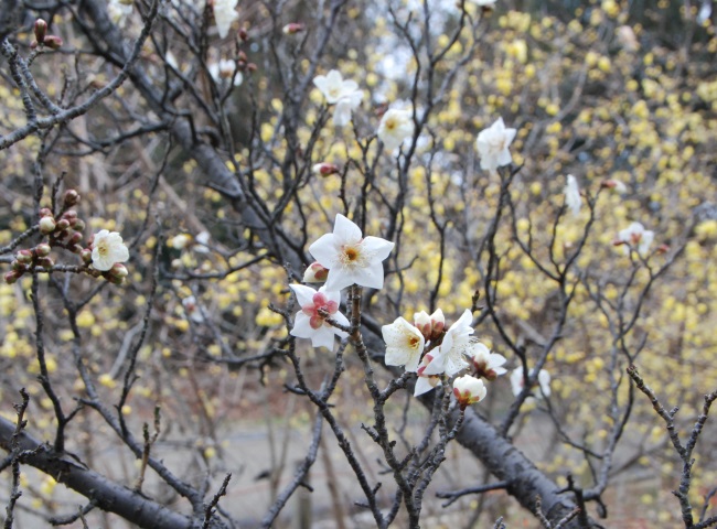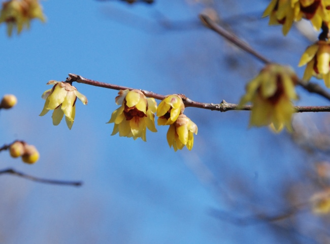 ソシンロウバイの花も、甘い香りを漂わせて咲いています。近くで、花の中心に模様の入る品種(満月)も咲いています。