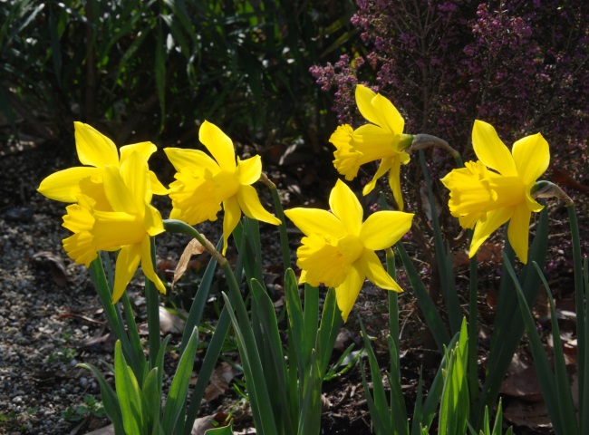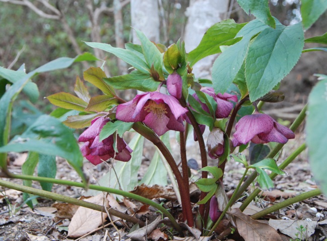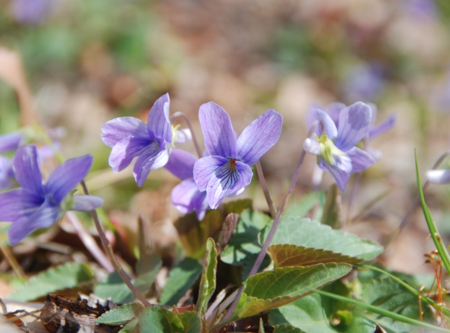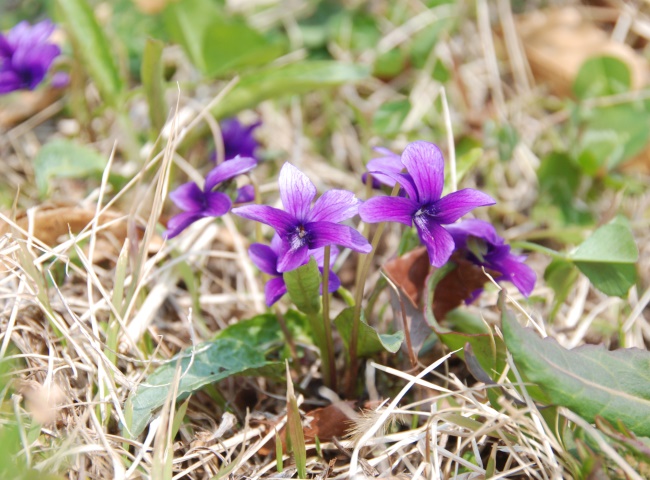アンズの近くの足下で、スミレが咲いています。花を横から見ると、大工道具の墨入れに似ているため、スミレと名前が付いたと言われています。