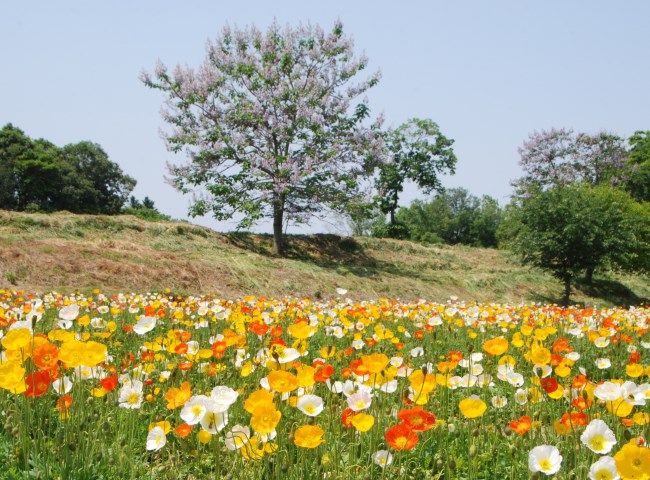 「春まちの丘」近くのお花畑で、アイスランドポピーが咲き始めました。後方ではキリが満開です。