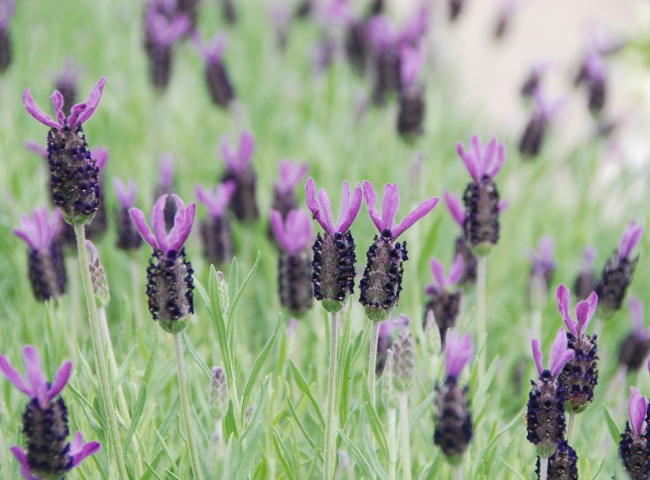 「県民協働花壇」でフレンチラベンダーが、ウサギの耳のようなかわいい花を咲かせています。