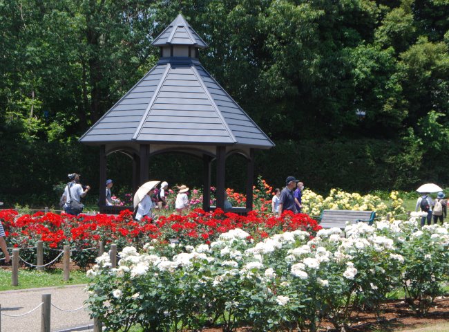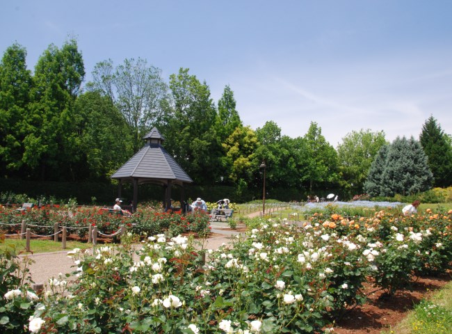 バラ園は5分咲きぐらいになりました。手前の白いバラは、「マーガレットメリル」という品種です。