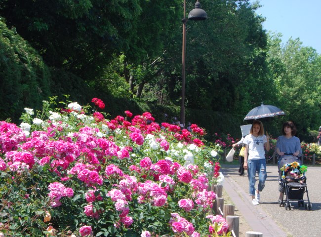 満開の「バラ園」にはたくさんの人が集まっています。花だけでなく香りも楽しまれていました。