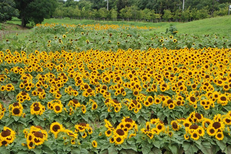 背が低いスマイルラッシュという品種は、台風の影響をほとんど受けませんでした。現在満開です。ヒマワリ観賞はお早めに。