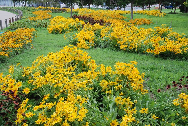 「彩りの広場」のルドベキアは、少し倒れたぐらいで綺麗に咲いています。これからはヒマワリに替わって、ルドベキアが主役です。