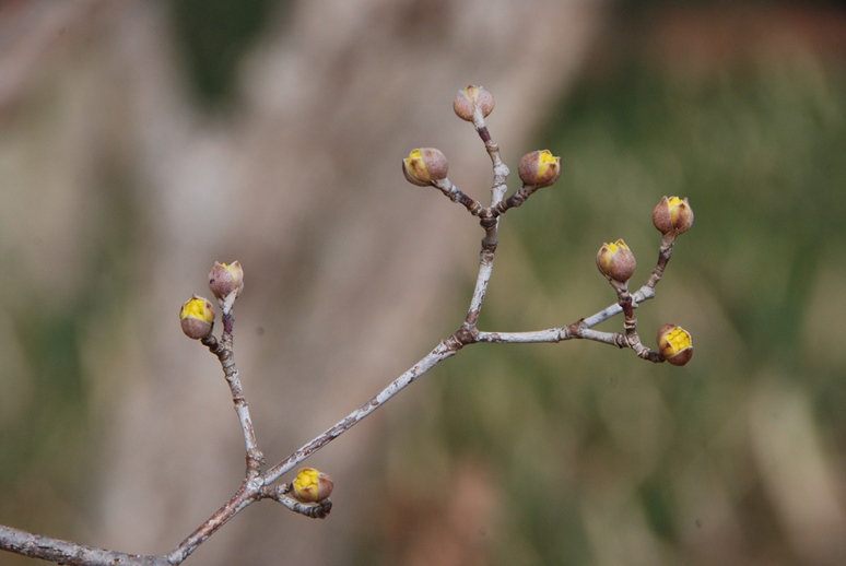 サンシュユの小さな黄色い花が、つぼみから少しのぞいていました。