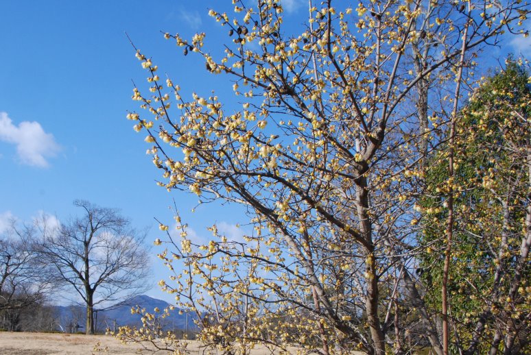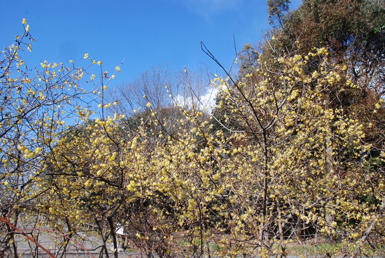 「いにしえの丘」のロウバイです。木によっては満開近くのものもあります。「中央臨時駐車場」前は満開です。