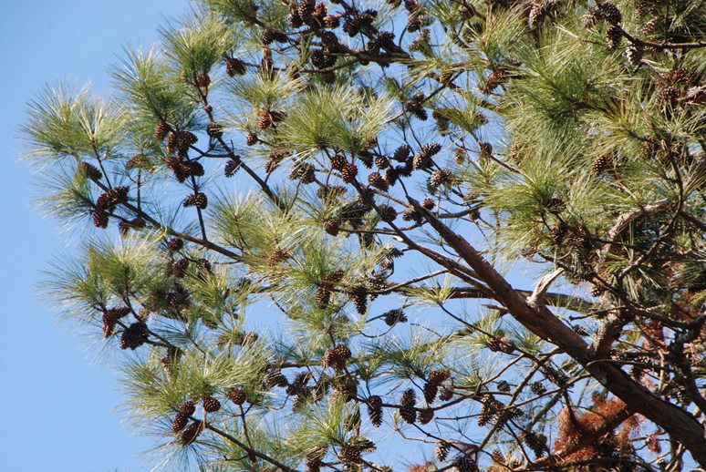 「ナガレ山古墳」北側の松に、松ぼっくりがたくさん付いていました。
