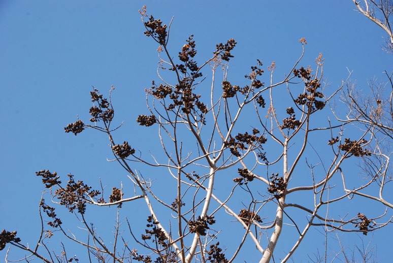 キリにも大きな黒い実がたくさん付いています。よく見ると実の近くで、小さな花芽も確認できます。