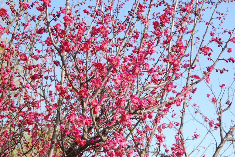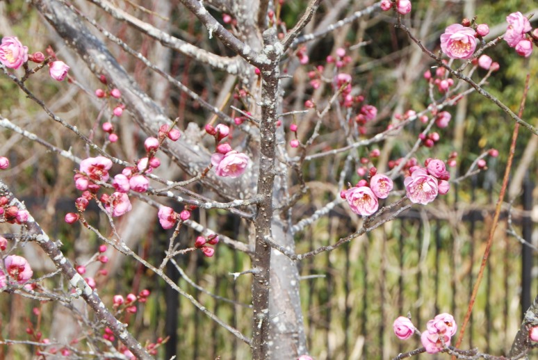 今日の梅林の様子です。早くから咲いていた写真の紅梅は、3分咲きぐらいになりました。