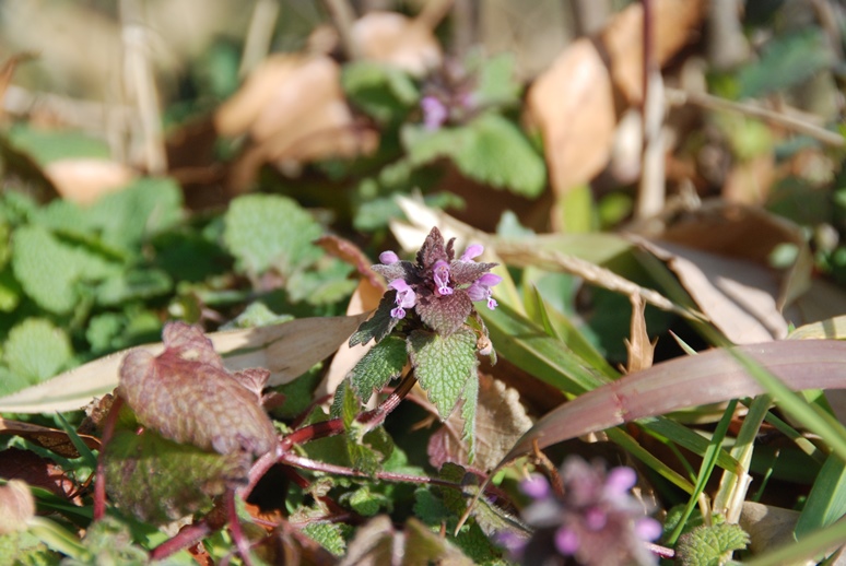 園内の草地で、ホトケノザ(写真)やオオイヌノフグリなどの春の野草が咲き始めました。