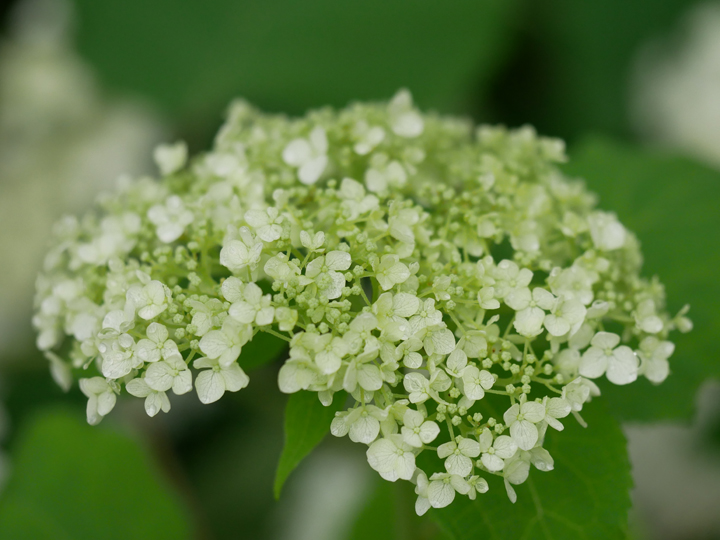 激しい雨が続きましたが、あじさいは、しっとりと佇みながら咲いています。写真は白色のアナベルです。