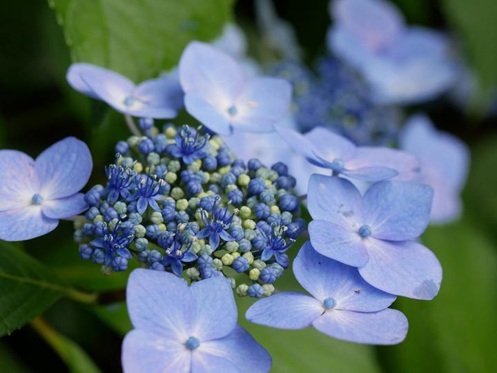 ガクアジサイの中心にある真花が咲いています。この花が咲いた日を開花日と呼ぶそうです。ちなみに周囲の花は装飾花と呼びます。