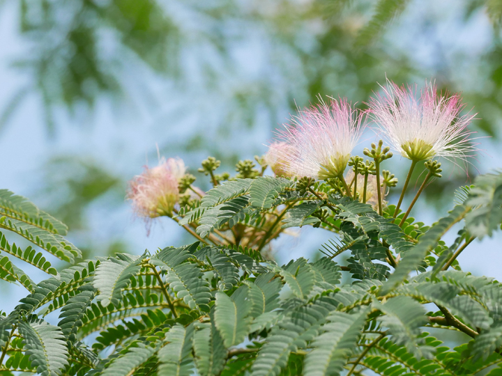 ネムノキ(合歓木)が咲いていました。ピンク色のおしべが長くのびて風に揺らいでいます。田植え時期の花として知られています。
