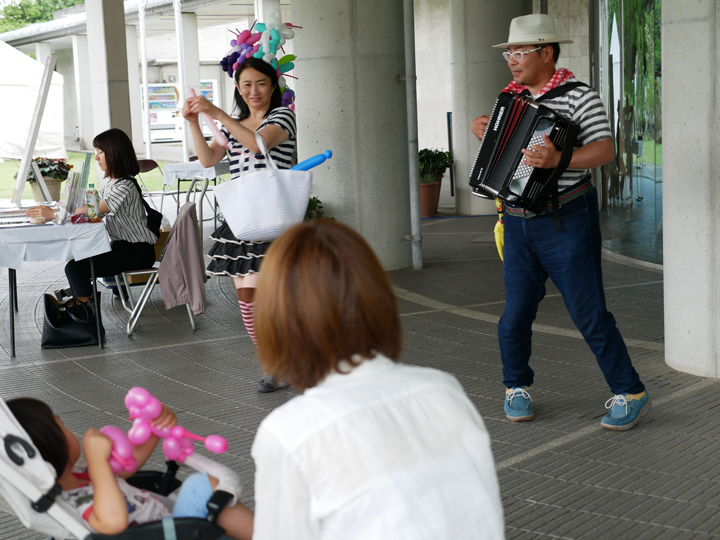 今日は小雨が時折降る天候のため、大道芸は軒下で行なわれました。