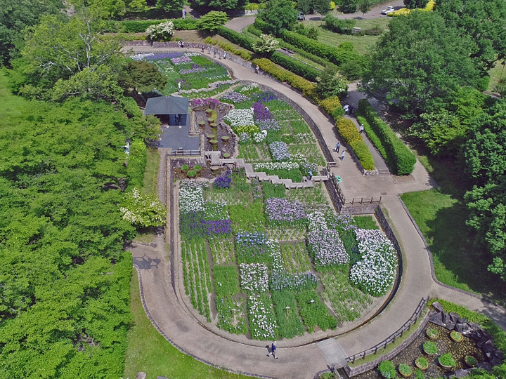 花菖蒲園は7分咲きぐらいですが、上空から見ると、まだ満開になっていない品種が沢山あります。[ドローン撮影]