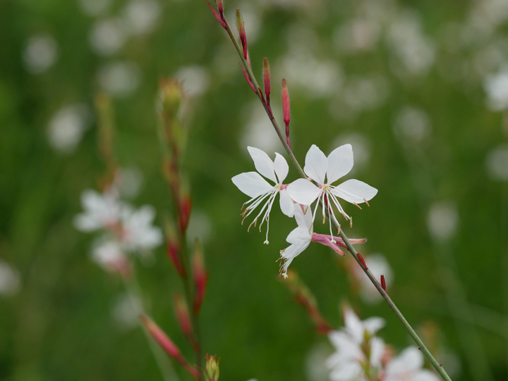 細長い茎に次々と可憐な花を咲かせるガウラが咲き続けています。夏の訪れと伴に咲き始め秋まで続きます。