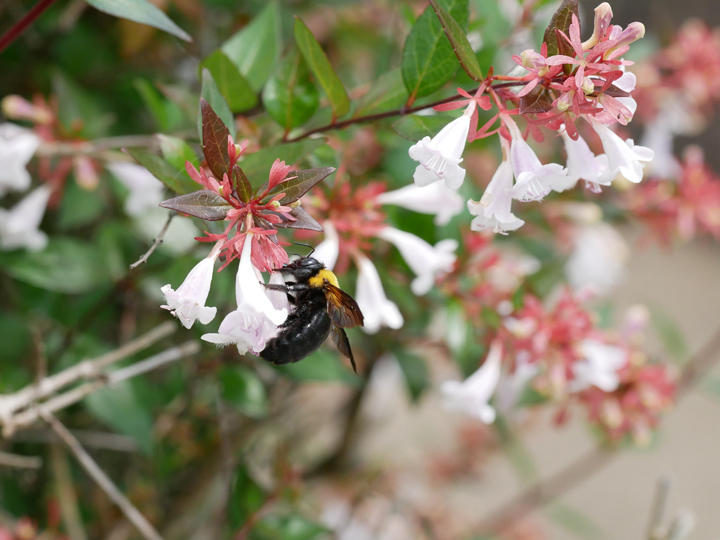 セイヨウニンジンボクも爽やかなスミレ色の花を咲かせています。一見するとブッドレアに似ていますが、こちらはシソ科で一つ一つの花の形が違います。同じように虫たちが蜜を求めてやってきます。