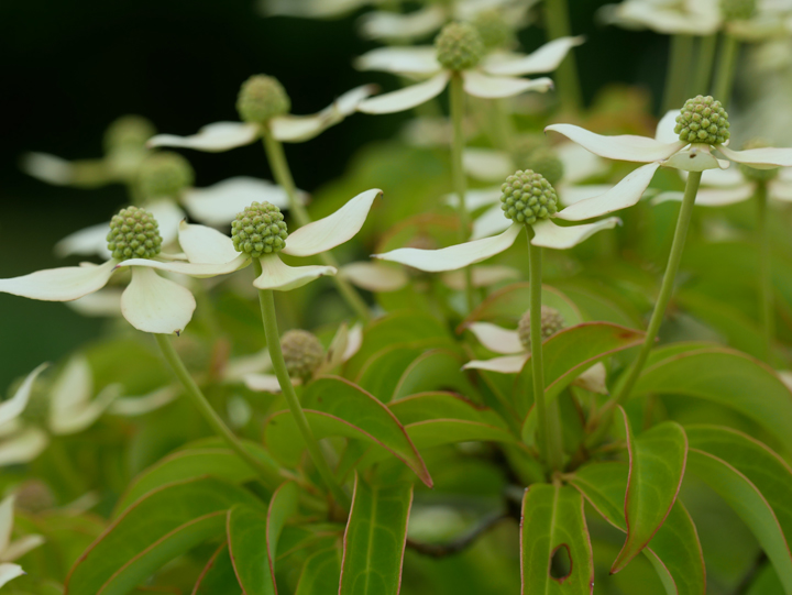 常緑のヤマボウシ(ホンコンエンシス)が咲いています。最近の品種で落葉樹である在来のヤマボウシに比べて葉の様子などが違っています。