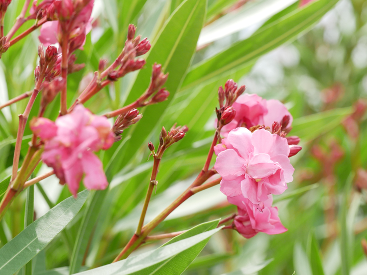 夏の花木として代表的なキョウチクトウが咲き始めました。大気汚染や乾燥に強いため街路樹として利用された時期もありました。