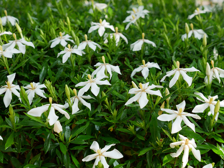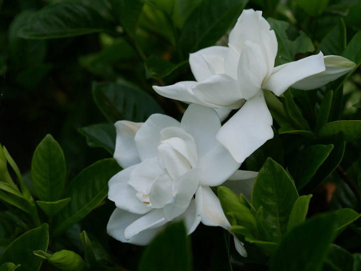 八重咲きのクチナシが満開です。アジサイを見ていると甘い香りが漂っているので、思わず足を止めます。一重咲きと違って実はつけません。