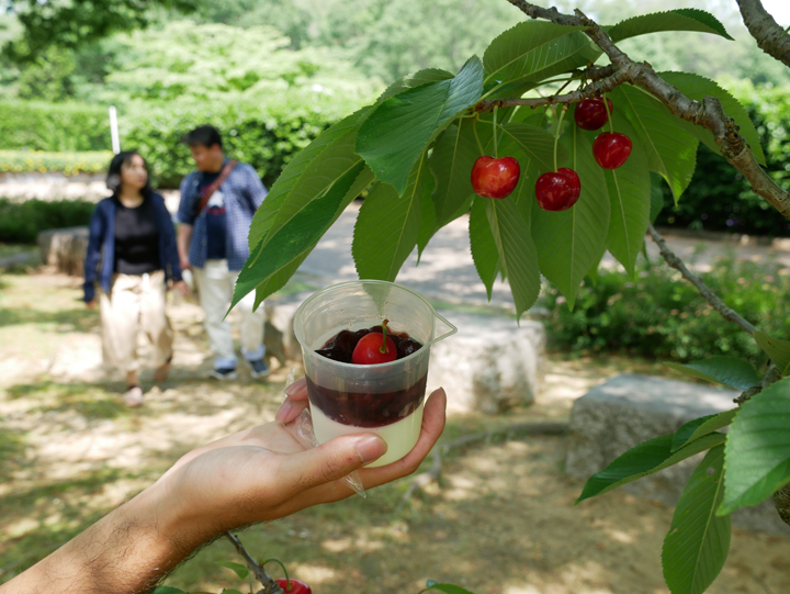 ケヤキ広場では県産さくらんぼが販売されていました。スイーツなどの加工品もあり人気でした。