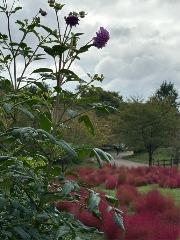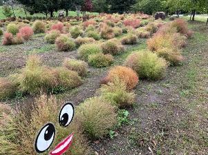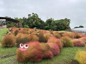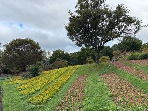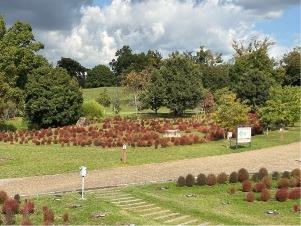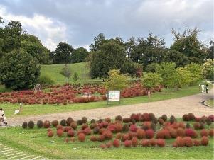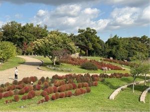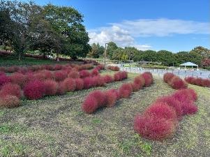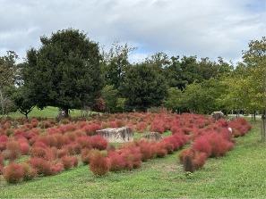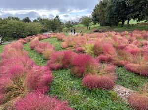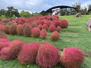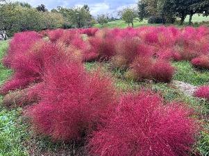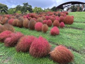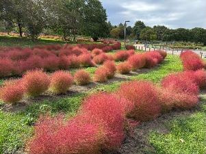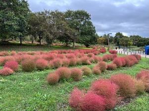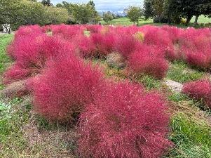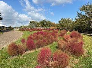 コキアも、赤く色着いております。一部、生育が進んでいるカリヨンの丘で枯れ込んでいる株があります。「集いの丘/北エリア」「彩りの広場/北」「カリヨンの丘/南エリア」