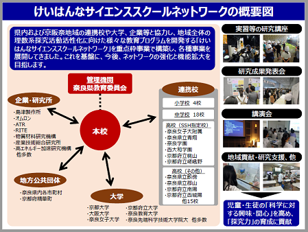 奈良高等学校が立ち上げた「けいはんなSSネットワーク」は、京都府・大阪府・奈良県の理数系探究活動の活性化を促す教育プログラムを大学・企業等・教育関係機関と連携して実践するネットワークで、現在県内16校に加えて京都と大阪の22校、計38校のおよそ460名が参加しています。この「けいはんなSSネットワーク」に参加する学校が中心となって発表する機会となっています。