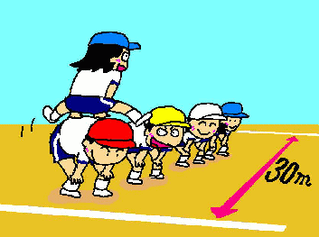 - 30mのきょりを連続(れんぞく)馬(うま)とびでとび終(お)わるまでに何秒(なんびょう)かかるかを計(はか)る。