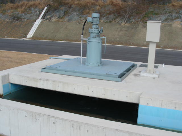 水のない時の写真ですが、フロックは、写真右の多数の孔から次のフロック形成池へ流れていきます。