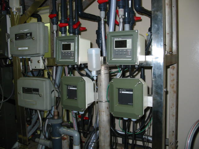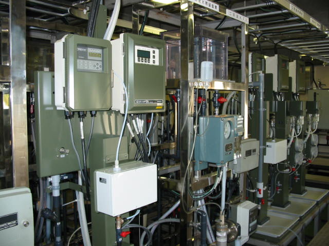各浄水過程の水をサンプリングポンプによってここに集め、各水質計器によって24時間水質を監視しています。