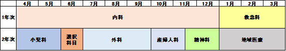 | 救急科 | 12週 | 土庫病院 救急外来で遭遇する患者、病棟で急変した患者に対し、必要な初期対応ができることを目指す。 |