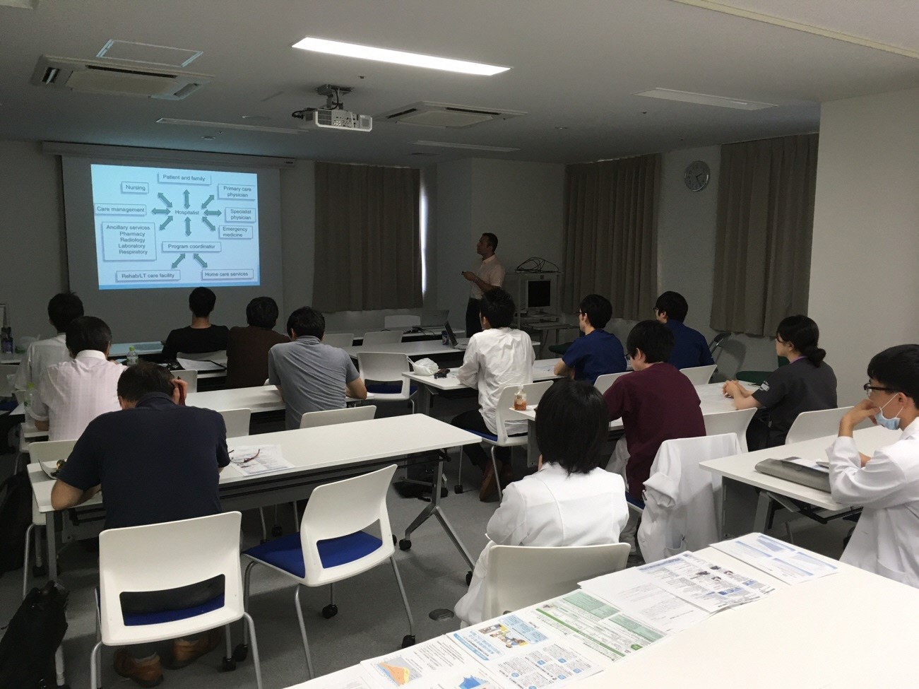 総合内科の石丸裕康先生からは、急速な高齢化などの社会的要請から医師のキャリアパスの変化へのニーズ、内科・総合診療専門医の教育に対する総合内科の責務についてご教示頂きました。在宅センターの次橋幸男先生からは、病院医師に対する在宅研修の紹介が行われました。参加者からも活発な質問があり、日米の比較だけではなく、総合診療の今後を考える上でも貴重な情報共有、議論が行われました。