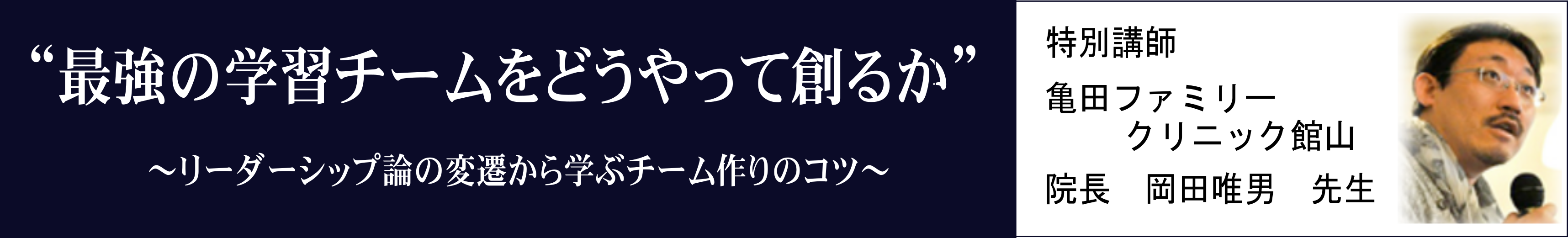 日本の総合診療のパイオニアとして御高名な亀田ファミリークリニック館山院長の岡田唯男先生をお招きし、総合診療医を養成する指導医や総合診療医を目指す、医師、医学生に対して、「最強の学習チームをどうやって創るか~リーダーシップ論の変遷から学ぶチーム作りのコツ~」と題してリーダーシップ論をご講演頂きました。