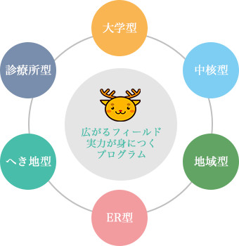奈良県には6つの基幹施設があり、多様な研修プログラムと、奈良県立医科大学附属病院を中心とした強力なネットワークを持って、総合診療医・家庭医の育成に力を注いでいます。大学型、中核型、診療所型、へき地型など、様々なフィールドでの研修が可能です。