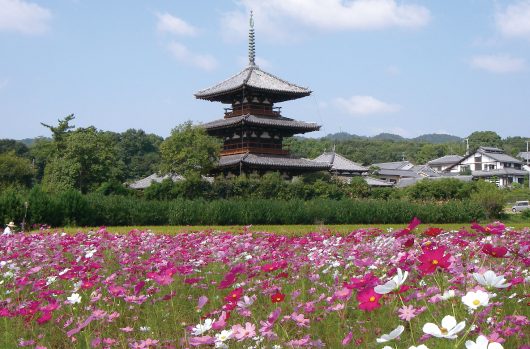 法起寺のまわりには田園風景が広がり、塔と自然の織りなす風景が多くの写真愛好家の心をつかんでいます。三重塔に昇る朝日、三重塔に湧き出る入道雲、そして秋のコスモスなど、四季折々に見せるさまざな表情をお楽しみください。また、法起寺周辺には、農家さんの直売所もあり、春はイチゴ、夏は梨、秋は柿などが販売されていますので、ぜひお立ち寄りください。