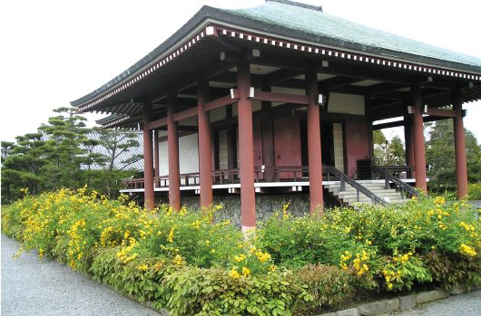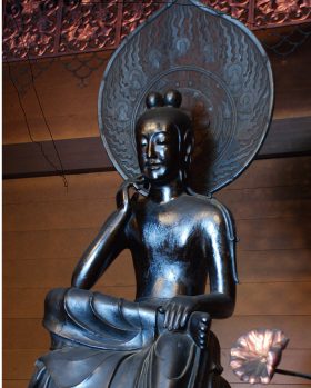 中宮寺の菩薩半跏像は、スフィンクス・モナリザと並び、世界三大微笑のひとつと言われる美しい仏様。右足を左膝に乗せて座り、右手を頬に添えて考えるしぐさの飛鳥仏です。2016年には、日本の弥勒菩薩像を代表し、韓国に渡り、韓国国立中央博物館の国宝仏とともに「ほほえみの御仏」として公開されました。また、4月から5月には境内にヤマブキの花が咲き、とてもきれいです。法隆寺の東院伽藍のすぐお隣なので、菩薩半跏像の優しいほほえみに癒されてください。