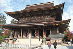 役行者が開いたという修験道の根本道場、金峯山寺の本堂。高さ34メートルの大伽藍は、木造建築では東大寺大仏殿に次ぐ大きさ。現在の本堂は1592(天正20)年に再建されたもので、重層入母屋造り檜皮葺きの建築美でも知られている。2月の節分会、4月の花供懺法会、7月の蓮華会・蛙飛び行事などの年中行事のほか、多数の行事が行われる。