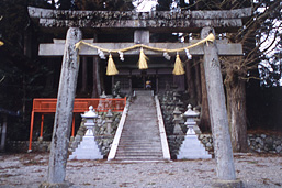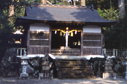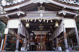 本殿は素木の神明造で、祭神は天津児屋根命(あまつこやねのみこと)。また鳥居の横に植えられたイチョウの木は、葉の先がロート状にくるりと巻くラッパ型で「ラッパイチョウ」と呼ばれ、珍しいもの。現在、全国でラッパイチョウが発見されているが、このラッパイチョウが1969年に日本で初めて発見された。樹高約20m、幹周約5.4mの巨樹で、奈良県の保護樹木に指定されている。