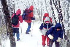 まずは神社に手を合わせてから避難小屋に入った。小屋は寒風を避ける登山者でごった返していたが、何とか場所を確保して、ガスストーブを取り出す。お弁当もいいが、やはり冬の山ならば温かいものが食べたくなるものだ。お湯を沸かして、ラーメンをすすると人心地ついた。出口から外に顔を出すと、さっきまで山頂付近を取り巻いていたガスがなくなり、晴れ間が見えている。展望台に備え付けの双眼鏡は凍り付いて使い物にならないが、周囲の山並みがよく見える。不思議なものだが、真っ白になっているのはこの高見山山頂だけで、周囲の山々はさほどでもない。樹氷の山、高見山の秘密は、その地理的条件や地形にもあるのかもしれないな、などとつらつらと考えてみる。思いのほか長居をしてしまったが、そろそろ下山の準備に取り掛かろう。下りの斜面を考えて、ここで軽アイゼンを装着することにした。多くの人に踏み固められた道は、登りは何とかこなせても下りはことのほか滑りやすい。登りには使わなかったストックも、クルクルとねじって長くした。これがあるのとないのとではバランスのとり方が大違いなのだ。下りは中腹の分岐から平野への道をとることにする。平野にはたかすみ温泉がある。冷え切った体を温めるにはもうしばらく歩かねばならないが、少し疲れが感じられるくらいのほうが、温泉のありがたみがわかるというものだ。あせらずに、ゆっくりと下りていくことにしよう。