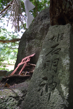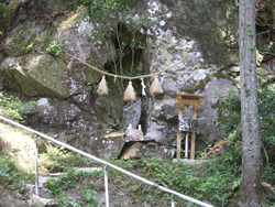 陰陽石崇拝の遺跡。大己貴命(おおむなちのみこと)を祭祀していた佐田の宮城は、平維盛が一時隠れ潜んだといわれています。ここには空海が修行中に刻んだといわれる梵字の石が残っています