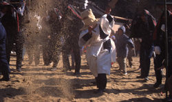『日本書紀』天武天皇4年(675)に「廣瀬の河曲に大忌神を祀らしむ」とあり、龍田の風神と共に国家的な神事が営まれていました。祭神は若宇加能売命で、水の神・五穀豊穣の神として広く信仰されています。毎年2月11日に行われる「砂かけ祭り」は大和の奇祭のひとつとして有名です。拝殿前で田人・牛役と参拝者がかけあう砂が激しく舞うほど雨に恵まれ豊作になると伝えられています。(本殿、県指定文化財)