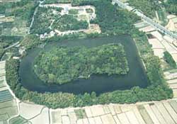 全長112メートル、後円部直径60メートル、前方部幅45メートル、4世紀後半に築造された前方後円墳。明治14年(1881)に家屋文鏡を含む多量の銅鏡やさまざまな副葬品が出土したことで有名です。これらの出土品の大部分は平成13年6月22日に重要文化財に指定されました。(国指定史跡)―金鳥伝説―佐味田宝塚古墳は昔から黄金山と呼ばれてきました。毎年元日、この黄金山にどこからともなく金の鳥が飛んできて、美しい声でさえずるのですが、不思議なことに金の鳥がさえずった後は、この辺りだけはいくら雪が降っても積もらなかったといいます。この伝説をたよりに地元の人々が発掘したところ、たくさんの貴重な遺物が発見されました。