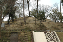 東向きの帆立貝式古墳で、墳丘全長45メートル、直径41.4メートル、高さ6.5メートルの後円部に幅22メートル、長さ7メートルの短い前方部が付いています。周囲に馬蹄形の周濠が掘られ、さらに外堤があり、堤を含めた全長は62メートルとなります。墳丘は二段築成で、第一段目には円筒埴輪の他に蓋、短甲、家形埴輪が立てられていました。墳丘と周濠には葺石が施され、葺石の作業単位がよく残っています。前方部南東隅には、張出部が設けられ、周濠幅が狭くなっています。埋葬施設は未調査で、埴輪から古墳時代中期後葉の築造と考えられています。古墳の遺構を盛土で保存した上に、かさあげ方式で築造。当初の姿に復元整備してあります。(県指定史跡)。
