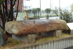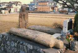 狐井城山古墳の南約550メートル位置し、昭和44年の初田川改修時まで阿弥陀橋の橋板に使用されていた竜山石製の長持形石棺蓋石(市指定)です。現地では石棺蓋石を縦に半裁し、一片は縄掛突起を阿弥陀如来の頭部にみたて地中に埋め込んで直立させています。もう一片は橋板に利用されていたもので、西側に横転させています。東側には石室の天井石片があります。この石棺の復元品は、刳抜式長持形石棺蓋石とともに、ふたかみ文化センター前庭で展示しています。石棺蓋石(西側)全長3.2メートル、幅0.60メートル 石棺蓋石(直立)全長1.46メートル、幅0.65メートル 石室天井石片(東側)全長2.15メートル、幅0.85メートル。