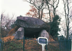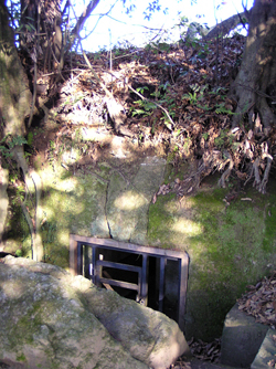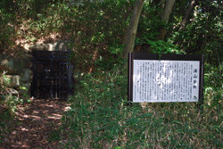 鳥屋史跡公園の北側に隣接して巨岩が露出しているのが小谷古墳です。小谷古墳は貝吹山から北東にのびる大きな屋根とそこから枝分かれした支尾根を利用して築かれており、北側の尾根の山腹には、半円状に自然地形を切り取った部分があります。墳丘の各所は山崩れを起こし、変形していて円墳か方墳かは定かではありませんが、南側に横穴式石室の入口が突き出すようなかたちで露出しています。石棺の奥や右側に広い空間があるため、他に二棺置かれていたと推定されており、一古墳三棺の聖徳太子と同じ「三骨一廟式」の墳墓と考えられています。