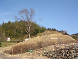 宣化天皇陵と船付山のある尾根の南側に位置していて、一辺が85メートル、高さ15メートルの二段構成の大方墳で、わが国最大の方墳です。倭彦命身狭桃花鳥坂墓(やまとひこのみこと・むさのつきさかのはか)に治定され、前方後円形の玉垣が周囲をめぐっています。東側に接するため池の岸から採集された円筒埴輪片は中期古墳の埴輪の特徴をそなえており、宣化陵より古いと考えられています。
