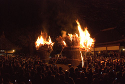 この地は修験道の開祖役行者神変大菩薩の出生地とされています。当寺は役小角の創建と云え、境内の一角には産湯の井戸が残されています。西に聳える葛城山系は、若き日の小角の修行の場であり、その主峰金剛山は、小角が鬼神を使って金峯山(大峯山)との間に石橋を架けさせようとした所です。後に葛城山系の峰々には、法華経が一品(いちぼん)ずつ埋納され(葛城廿八宿)、現在も葛城修験の道場として信仰されています。