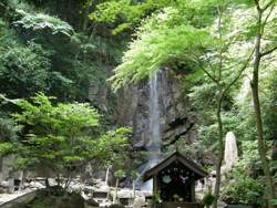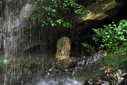 高さ約23メートルの岩肌を流れ落ちる美瀑。布留川の上流にあたり、春日断層崖の中では最大の滝といわれています。「布留の滝」と古今和歌集にも詠まれ、古くから親しまれてきました。市街地とは気温が5~6度違うので、夏は避暑地として、訪れる人を楽しませてくれます。また、行者さんの修行の場としても知られ、冬でも薄い衣1枚で一心に滝に打たれる姿を見かけます。滝のなかほどにはお不動さまが、また滝壺の手前左側には不動三尊磨崖仏(鎌倉時代中期)が見守っています。